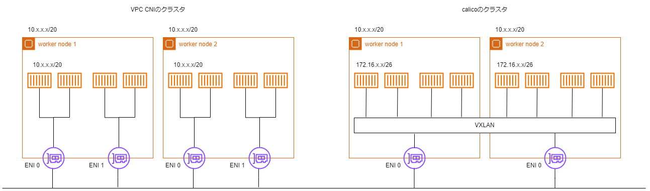 VPC CNIとCalicoではコンテナ間通信を実現するための実装が異なり、 模式図としては下記のようになります。