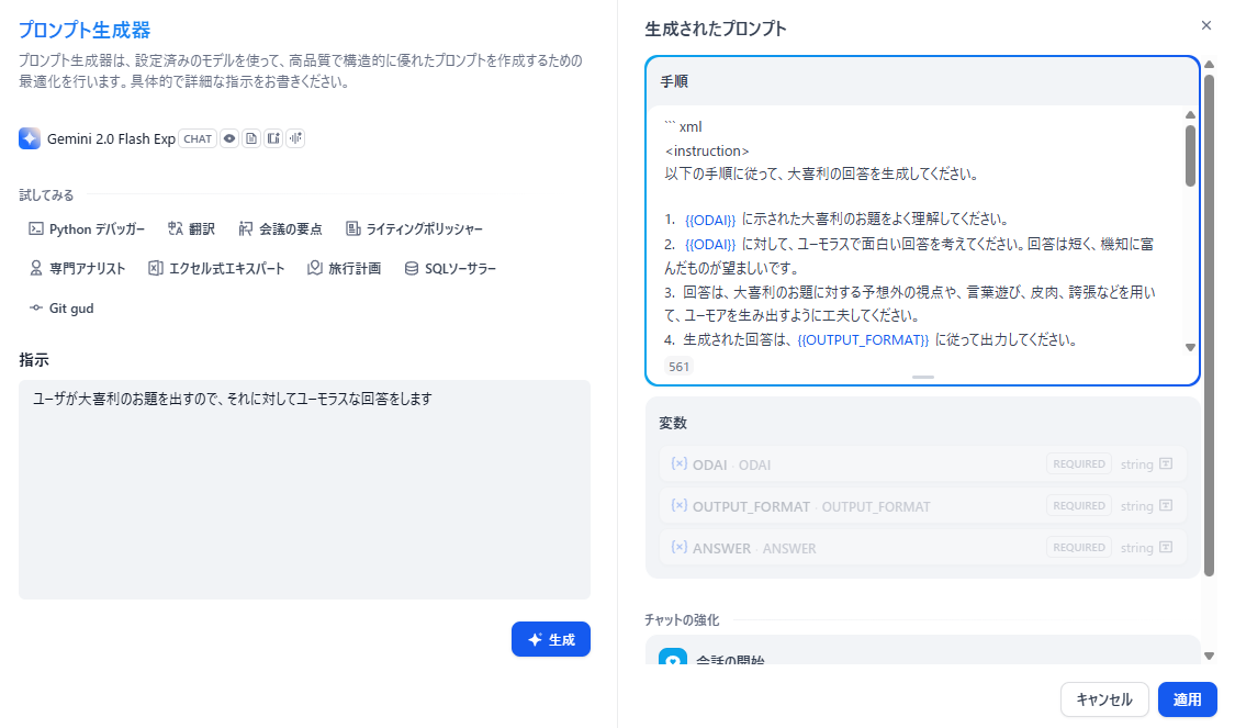 また、最近のAIアプリらしく、アプリの設定自体をAIがブラッシュアップする機能が搭載されているので、 こんなアプリが作りたいな〜というのをインプットして出てきた結果をブラッシュアップする、 というやり方で簡単に生成することができました。