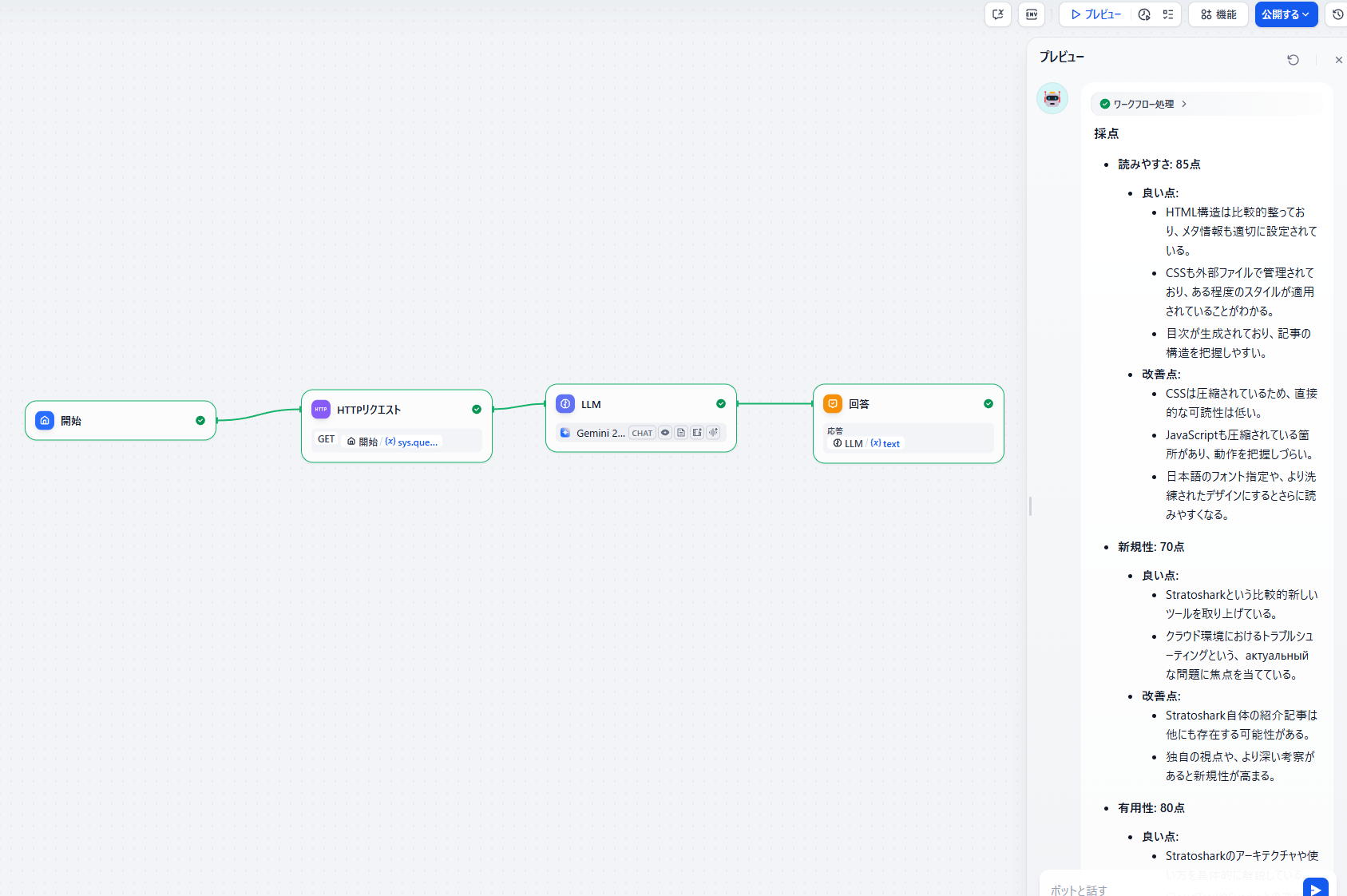 HTTPのリクエスト処理や、コンテンツだけの取得といった処理は、 Dify側でやってくれるので、取得したBody部分だけをLLMに渡して処理するだけとノーコードで動かせます。