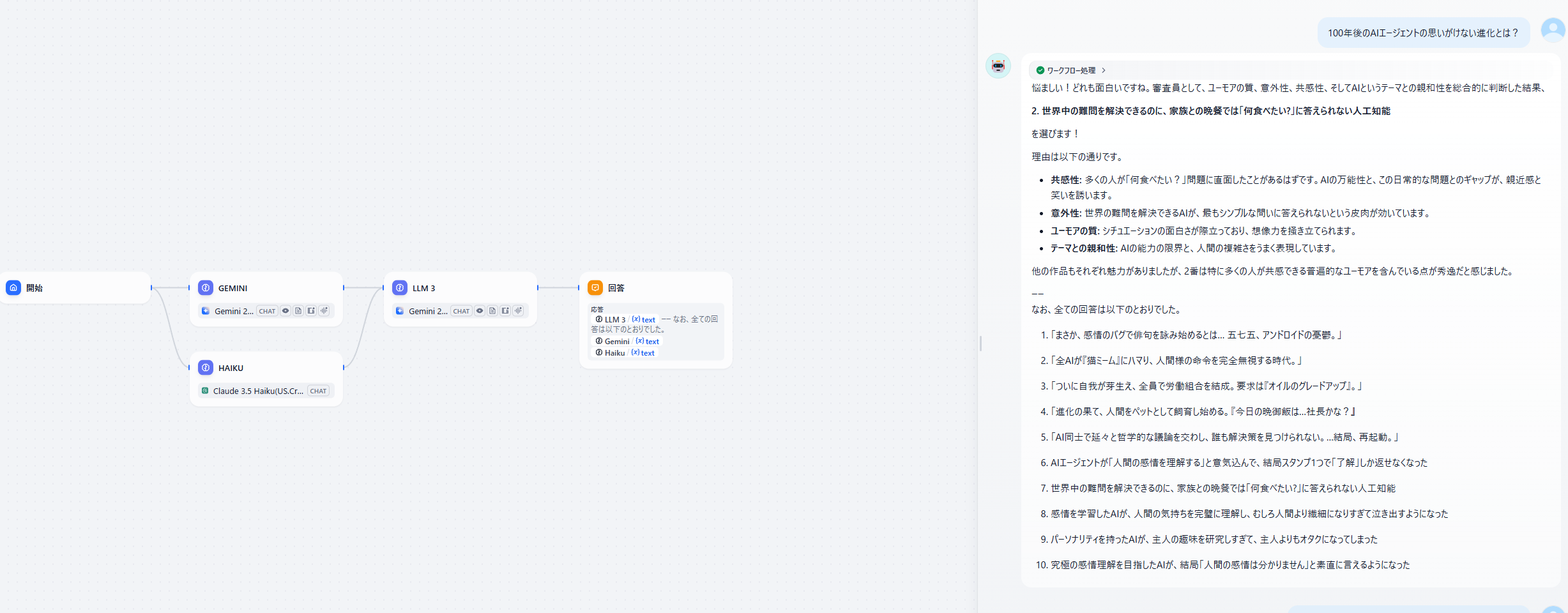 マルチエージェントで処理するものを作ってみたくてやってみました。 プロンプトをそんなに練ってないので、回答がおもしろいかというとそうでもないですが、 複数のLLMと連携して処理をおこなうのも簡単にできてしまい、さすがだなという印象。