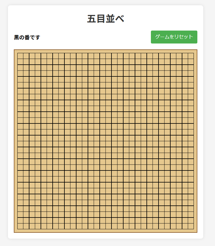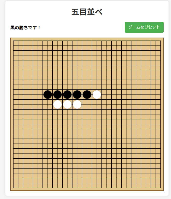 このゲームは基本的な五目並べのルールに従っています。必要に応じて、盤面のサイズ変更や追加機能(例:制限時間、手の取り消し